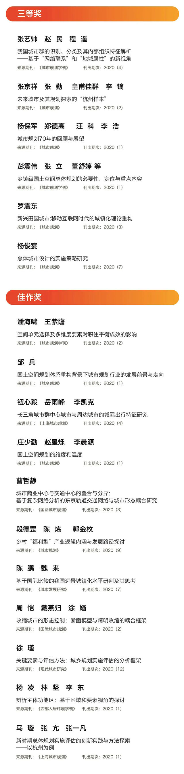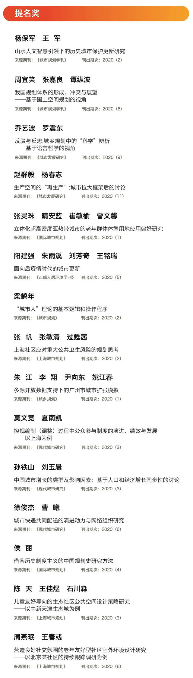 本次评选活动首先由以上期刊编辑部从该刊2020年度所有刊登的论文中推荐出42篇候选论文;然后由学会和基金聘请的13位初评委员于2021年5月通过投票方式从中推选出36篇获奖候选论文,其中21篇作为候选论文进入复评,另外15篇获提名奖;再由论文复评选委员会的87位评委对21篇获奖候选论文进行打分。最后根据73份有效选票的平均分数排名,确定一等奖1名,二等奖3名,三等奖6名,佳作奖11名。