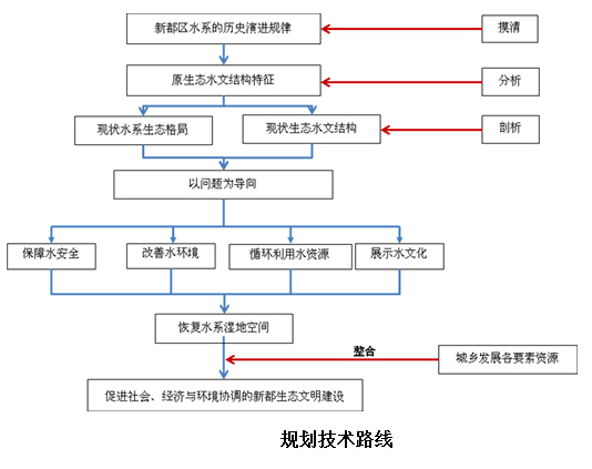 本规划在摸清新都区水系的历史演进规律中,复原历史水系原生态格局,分析原生态水文结构特征,剖析现状水系生态格局及生态水文结构缺失的原因,以问题为导向,以“保障水安全、改善水环境、循环利用水资源、展示水文化”为目标,以恢复水系湿地空间为载体,整合城乡发展各要素资源,促进社会、经济与环境协调的新都生态文明建设。