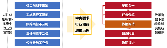 体检评估是“多规合一 - 任务分解 - 体检评估 - 督查问责 - 协同共治”总规编制-实施统筹机制中的重要一环,区别于以往的规划实施终期评估,常态化的年度体检从过程维度来解析政府年度行动和政策与规划实施结果的关系,建立“监测—诊断—预警—维护”闭环体系,对规划实施措施进行动态、及时优化完善,实现对总规编制-实施的系统性改革,解决了总规实施性弱的问题。通过建立工作组织、技术统合、数据获取、成果形成和应用五大机制,保障体检评估制度运行。