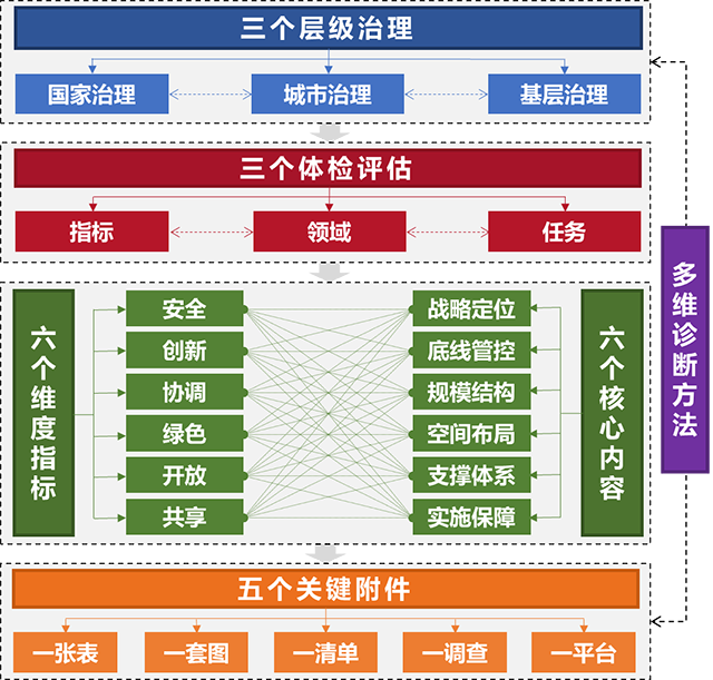 面对强化城市功能、提高服务水平、促进资源利用效益、构建全域国土空间开发保护格局、提高城市韧性、关注民生基础设施、推动区域协调等城市高质量发展要求,提出“三个层级治理(国家、城市、街道)、三个体检对象(指标、任务、领域)、六个核心内容(战略定位、底线管控、规模结构、空间布局、支撑体系、实施保障)、六个维度指标(安全、创新、协调、绿色、开放、共享)、五个关键附件(一张表、一套图、一清单、一调查、一平台)”的体检评估体系。从全面性、系统性、实操性出发为地方实践提供规范蓝本。