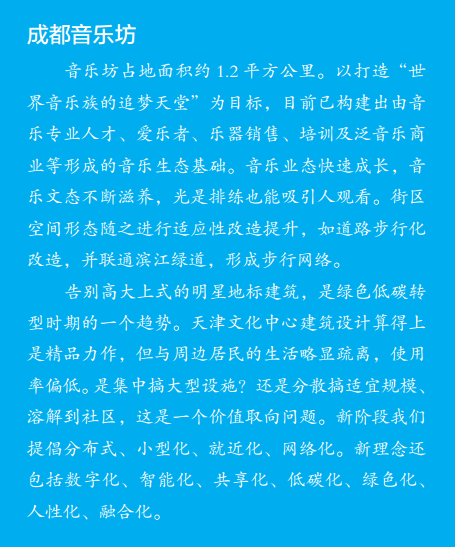 成都音乐坊是另一个成功案例。很多城市都在搞大型文化设施建设,但这些设施的选址很关键,往往决定后期的使用维护管理,影响着项目的成败。很多大型文化设施利用率不高,就是因为与周边社区拉开了距离,脱离了居民生活需要,无法产生日常生活的积极互动。成都决定建设一座音乐厅,先打听哪个城市的建得好,听说天津大剧院有名,就去天津考察,将设计团队(包括建筑、舞台、照明、声学设计)请来(建筑设计是德国GMP建筑事务所)。但成都音乐厅的选址贴近音乐学院,音乐学院就是音乐的沃土,左右两侧不远还有四川大学的华西校区和望江校区,高校有大量音乐爱好者,好比音乐气候,音乐厅好比一颗种子,播种在肥沃的土壤里,有适宜的气候,很快就会生根、发芽、结果。这就是由音乐厅这一触媒引起的城市更新,并逐渐使整个街区形成具有鲜明特色的音乐坊的故事。