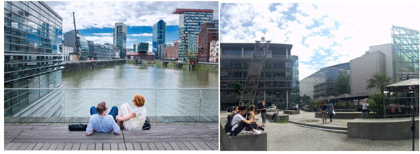 用地下隧道将莱茵河公路引入地下,大大提高了媒体港公共空间的可达性。2公里长的林荫大道两侧种有双排树,环境清幽,依托莱茵河滨河步行系统和城市景观上的连贯呼应,将媒体港的核心地段、市民公园、莱茵公园和旧城的城堡广场串连在一起,强化了城市公共空间系统的整体性;另一方面,规划设计注重公共空间的宜人尺度。联系媒体港两岸的步行桥两侧设置了木质大台阶,吸引了许多居民和游客驻足休憩、观景、晒日光浴。