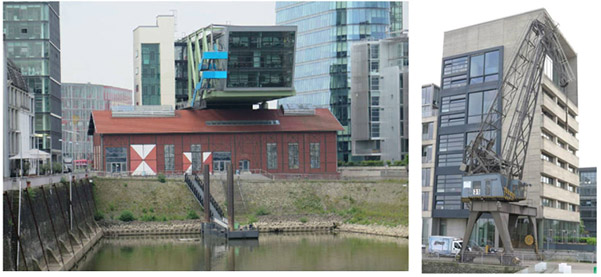 规划在现有城市结构基础上保持历史港口布局,实现新老建筑均衡的谨慎更新。除对一些仓库和港口建筑的保留,位于商业港口街的全部机械设备被作为历史港口建筑技术发展的见证,在1990年列入建筑保护名单。自1896年以来的码头墙、楼梯、铸铁灯箱和锻铁栏杆,以及码头区的旧轨道和起重机仍旧保留在港区,形成了媒体港独特的工业景观。