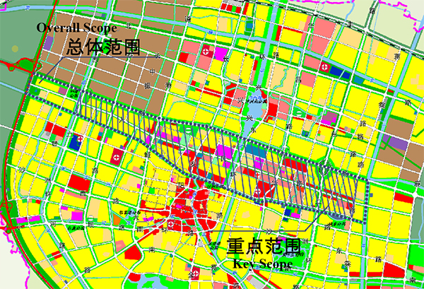 The planning scope is divided into two levels: Overall Scope and Key Scope, in which: the Overall Scope is to Zhangyang Highway in the north, Shugang Expressway in the west, Dongheng River in the south, and Ergan River in the east, with a total area of about 900 hectares, and the Renmin Road section is about 9 kilometers long; the Key Scope is to Zhangyang Highway in the north, Huancheng River in the west, Donghen River in the south and Jiangcheng Road in the east (see attached drawing for details)。