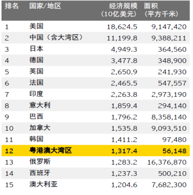 表1 大湾区是世界第12大经济体