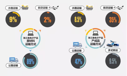 根据中规院深圳分院的研究,珠三角原材料与制成品的运输方式差异明显。以电子产品为例,其原材料高达89%的比例采用公路运输的方式,而制成品通过公路运输的比例仅为47%,通过航空运输的比例达到了35%,这个巨大的差异反映了该地区转型发展给供应链组织过程带来的影响。