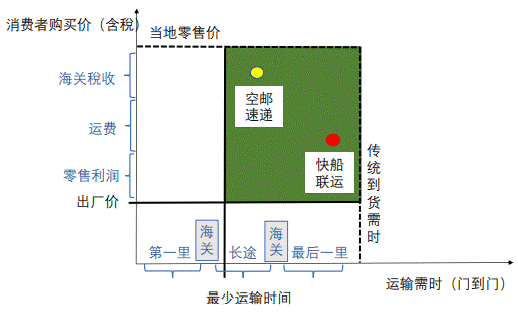 从消费者出发,则会形成一个另类的供应链和消费网络,影响B2C类跨境电商货品运输方式选择的两个关键指标是消费者购买价和到货需时(见图6),消费者参考当地同一商品的零售价格和传统到货需时,如果通过网络购物更便宜或更快速,则他们就会考虑在网上购物,也就是说,跨境电商经营者就是在下图的深色区域竞争,通常是想办法向左下角靠近,或按照消费者偏好寻找利基市场,因为消费者会在这两个方向上做效用极大化的选择。一旦网上购物的行为习惯形成,人们就有可能越来越多在网上购物,目前中国已有超过52%的社会消费品零售总额是通过网络实现的。