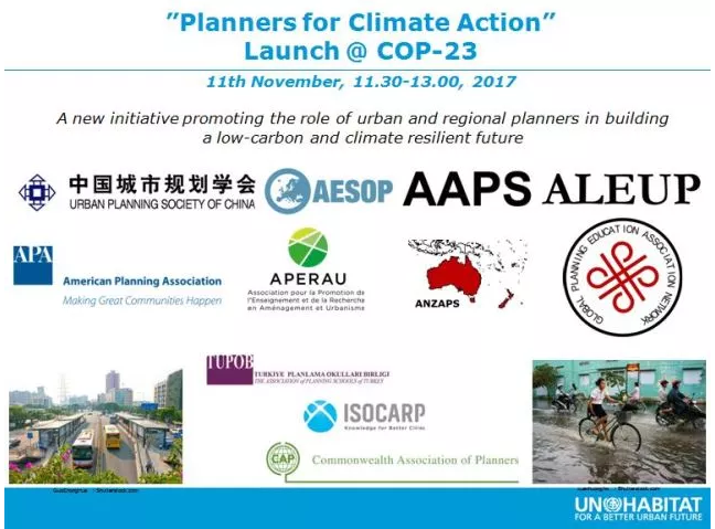 为了改变这种局面,强调规划师在应对气候变化领域的重要作用,贯彻落实联合国2030可持续发展议程和新城市议程,联合国人居署联合国际主要规划组织,在第23届联合国气候变化大会期间,以“应对气候变化的规划行动(Planner for Climate Action)”为主题举办活动,邀请主要规划组织负责人和学者发言,参加会议的将包括联合国人居署及其他联合国机构,联合国气候变化特别代表,相关国家的政府部长等。